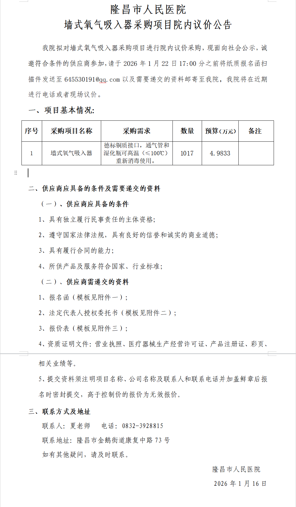 详情请点击下方附件下载 附件1:墙式氧气吸入器采购项目附件.doc 微信公众号(订阅通知) 微信小程序(查询信息) 本公告地址:https://www.120bid.com/view/2793/H-jdxZsBg7S5K-63pdHI.html 公告原网站链接
